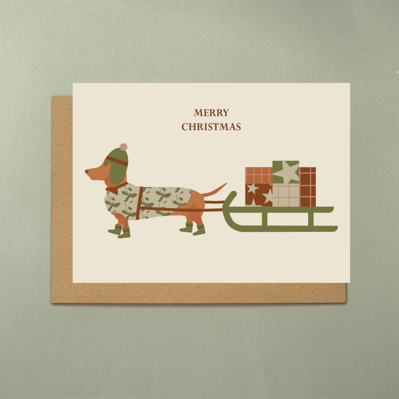 In deze set zitten de Kerstkaarten 3x dachshund and sled" en 3x "Christmas tree and dachshund".